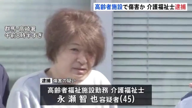 傷害の疑いで逮捕されたのは、高崎市の高齢者福祉施設に勤務する介護福祉士の永瀬智也容疑者(45)です。永瀬容疑者は今月8日、施設に入所する90代後半の女性の髪をつかんで投げ飛ばしたり蹴ったりするなど暴行を加え、女性の左手首を骨折させるなどの大けがをさせた疑いがもたれています。