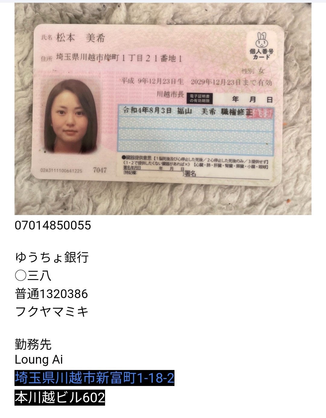 『再投稿』福山美希 詐欺師 – 闇金詐欺師の撲滅.com 内容をスキップ 福山美希28歳 埼玉県川越市在住 07014850055 勤務先 Loung Ai 返さず結局司法入れて飛ぶ詐欺女 絶対返さないので貸さないように 投稿ナビゲーション 投稿ナビゲーション 古山裕貴 借りパク 詐欺師